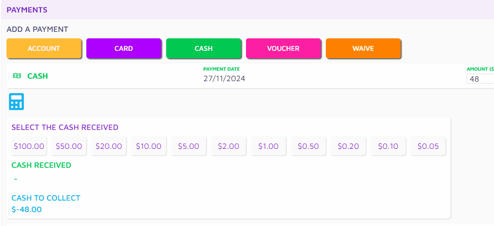 We’ve also added a calculator for Cash payments, allowing the operator to quickly add cash received to get a total amount to return!