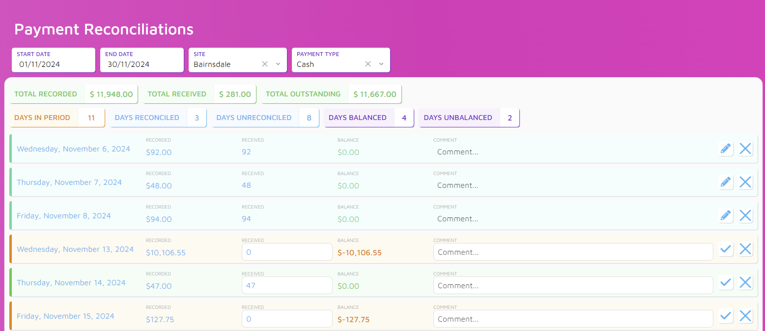 You can now record reconciliations for any site and any payment type, recording any discrepancies and balance on a daily basis.