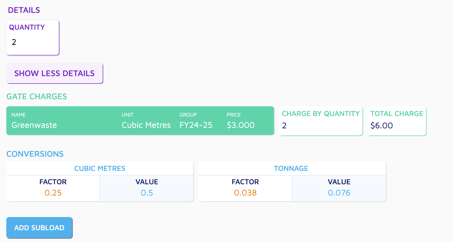 • We now hide a few of the fields on a subload that aren’t relevant to the operator (such as cubic/tonnage conversions and regulatory charge calculations), you now need to press the MORE DETAILS button to view these fields.